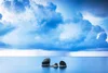Rocks and calm seas as a storm passes in the distance, Ko Samui, Thailand.