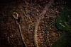 Aerial view of Red tractor plowing fields from hot-air balloon, Yarra Valley, Victoria, Australia