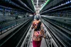 A woman walks between industrial spinning machines in factory at Banswara Syntex Limited, India.
